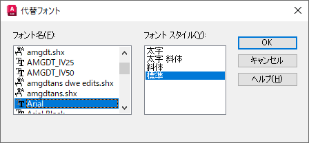 代替フォントを指定していない場合、開こうとしている図面ファイルで使用されているいずれかのフォントが見つからないとき、それぞれの見つからないフォントについて代りに使用するフォントを指定するためのダイアログ ボックスが表示されます。