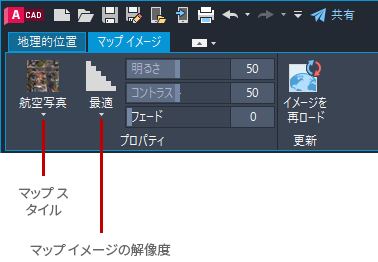 Autodesk Account にサイン インしている場合、マップ イメージの解像度を変更したり、範囲を修正したり、不透明度を調整したり、オンライン マップ サービスで使用可能な最新バージョンに更新することができます。