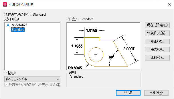 現在の寸法スタイルの名前が表示されます。既定の寸法スタイルは、Standard です。作成する寸法には現在のスタイルが適用されます。