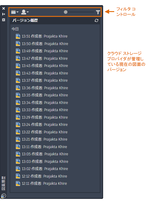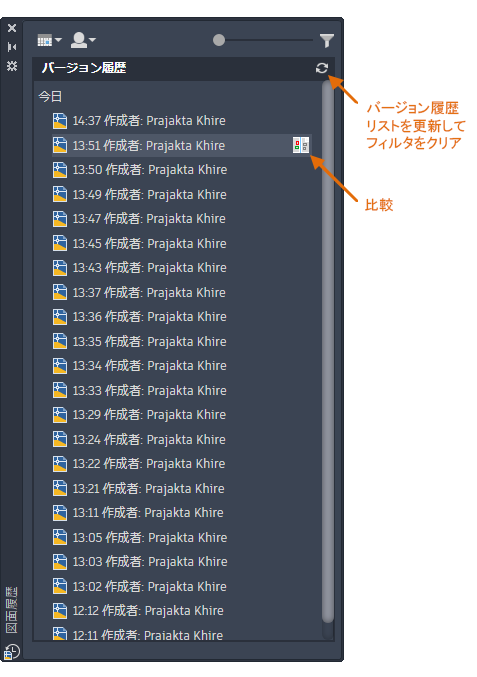 バージョン履歴リストを更新して、図面に対する最近の変更を表示し、フィルタ設定をクリアします。