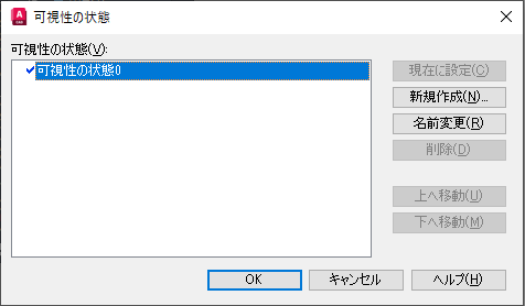 現在のダイナミック ブロック定義で使用できる可視性の状態がリストされます。このリストでの順番は、可視性の状態のリストを表示するためにグリップをクリックしたときにダイナミック ブロック参照で反映されます。リストの一番上に表示される状態は、ブロック参照の既定の状態です。
