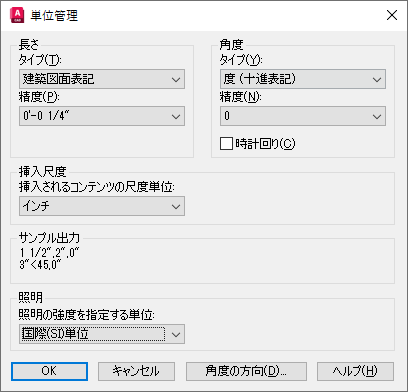 計測単位の形式には、建築図面表記、十進表記、工業図面表記、分数表記、指数表記があります。工業図面表記と建築図面表記の形式はフィートとインチで表示され、各作図単位は 1 インチを表すものとみなされます。他の形式は、実際の任意の単位で表すことができます。