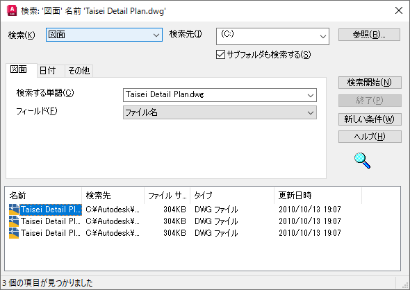検索する図面、ブロック、画層、外部参照の名前、またはその他のコンテンツの種類を指定します。