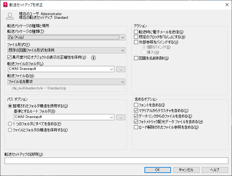 注: TrueType フォントは著作権保護されているため、転送パッケージの受信者も TrueType フォントを所有していることを確認する必要があります。受信者が TrueType フォントを所有しているかどうか分からない場合は、このオプションをオフにしてください。受信者が必要な TrueType フォントを使用できない場合、システム変数 FONTALT で指定したフォントが代替フォントとして使用されます。