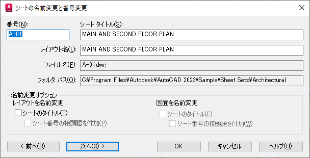 このチェック ボックスをオンにすると、図面ファイル名がシート タイトルに合わせて変更されます。
