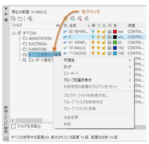 注: 画層リストをフィルタしたり、並べる帰ることによって、変更する画層の検索や選択が容易になります。