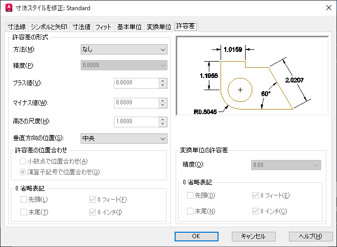 数値の先頭と末尾の 0(ゼロ)、およびフィート-インチ表記での 0(ゼロ)の省略をコントロールします。(システム変数 DIMTZIN[寸法許容差 0 省略])