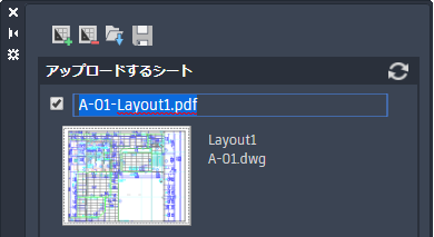 [Autodesk Docs にプッシュ]パレットが表示され、そこで PDF として Autodesk Docs にアップロードする AutoCAD レイアウトを選択できます。
