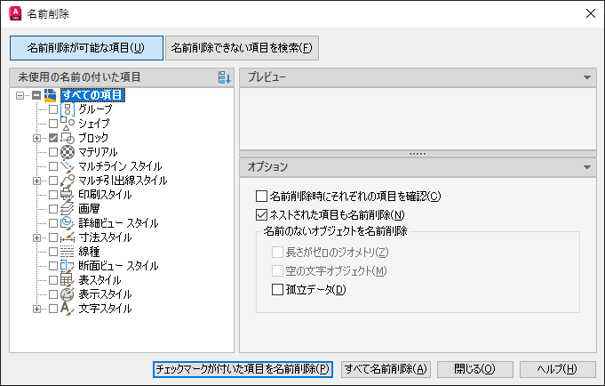 使用されていないブロック定義や画層などの項目を図面から削除します。名前削除可能な項目が表示され、図面内の名前削除できないオブジェクトを検索することができます。