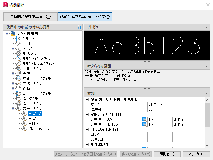 これらのほとんどのオブジェクトは現在図面で使用されているか、削除できない既定の項目です。名前の付いたオブジェクトを個々に選択すると、削除できない理由が表示されます。