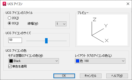 モデル空間での UCS アイコンのプレビューが表示されます。