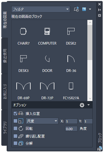 ブロックまたは図面を挿入できるタブ付きパレットが表示されます。