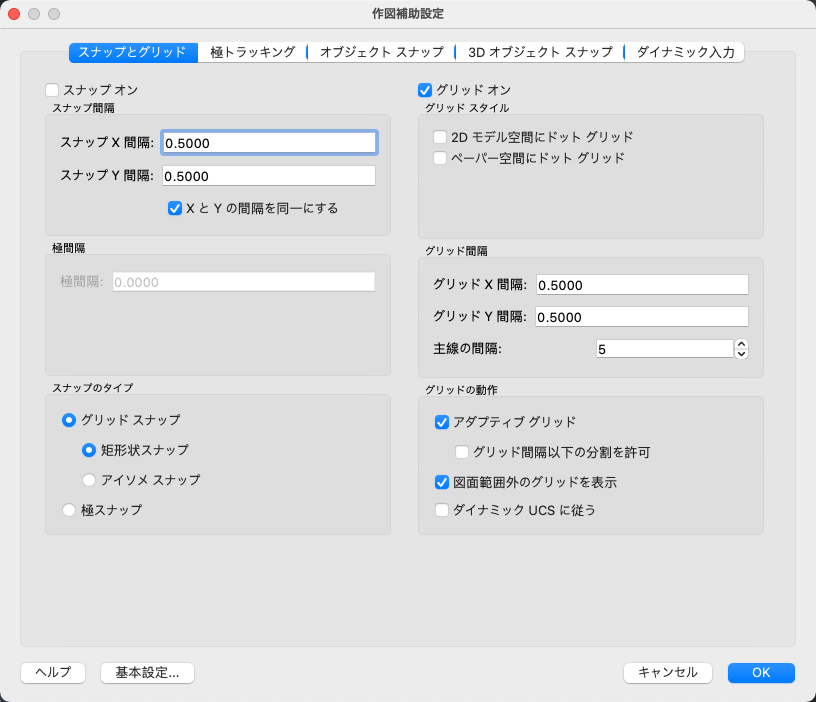 副グリッド線に対する主グリッド線の間隔を指定します。システム変数 GRIDSTYLE が 0 (ゼロ)に設定されている場合は、グリッド ドットではなくグリッド線が表示されます。(システム変数 GRIDMAJOR)