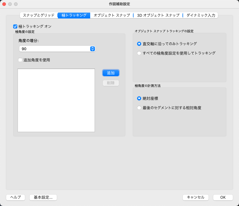 [追加角度を使用]をオンにすると、使用可能な追加角度が一覧表示されます。新しい角度を追加するには、[追加]をクリックします。既存の角度を削除するには、[削除]をクリックします。(システム変数 POLARADDANG)
