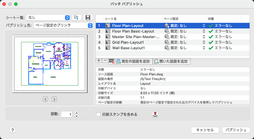 [シート]リストで選択したレイアウトのプレビューが表示されます。[次へ]または[前へ]ボタンをクリックして、[シート]リストの別のレイアウトをプレビューします。