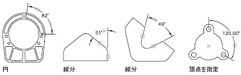 角度寸法は、2 本の線分がなす角度、または 3 つの点によって生成される角度を表します。