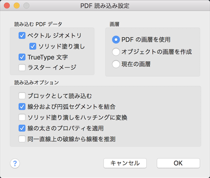 指定した PDF ファイルまたはアンダーレイからジオメトリ、塗り潰し、ラスター イメージ、TrueType 文字オブジェクトを読み込むためのオプションを設定します。