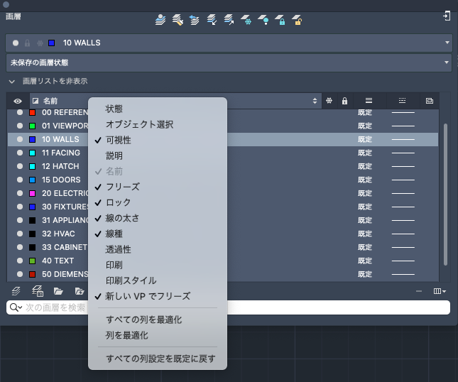 図面の画層とそのプロパティの一覧が表示されます。画層の追加、削除、名前変更を行ったり、画層のプロパティを変更したり、リアルタイムに変更を適用することができます。