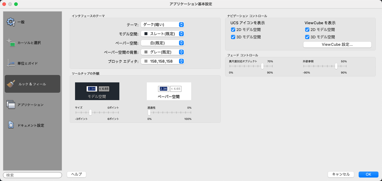 ステータス バー、パレット、図面ウィンドウなどの要素に適用するテーマをコントロールします。テーマとして、[暗い]または[明るい]を選択できます。