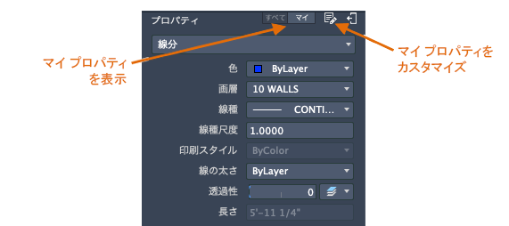 [プロパティ インスペクタ]を切り替えて、選択したオブジェクトのすべてのプロパティを表示したり、個人用にカスタマイズしたプロパティ リストを表示することができます。個人用にカスタマイズしたプロパティ リストをセット アップするには、[マイ プロパティをカスタマイズ]ボタンを使用します。