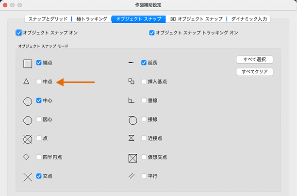 「定常オブジェクト スナップ」と呼ばれる既定のオブジェクト スナップを設定するには、OSNAP[オブジェクト スナップ設定]コマンドを使用します。たとえば、[中点]オブジェクト スナップを既定でオンにしておくと便利な場合があります。