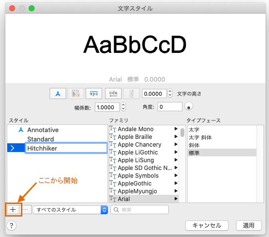 新しい文字スタイルを作成するときは、名前を指定してから、フォントとフォント スタイルを選択します。