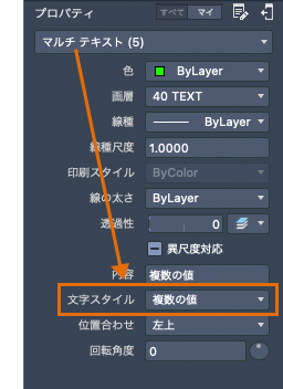 他のいくつかの注釈機能と同じように、マルチ テキストにも多数の設定が用意されています。このような設定は、STYLE[文字スタイル管理]コマンドを使用して「文字スタイル」 として保存できます。その後、[プロパティ インスペクタ]パレットの[文字スタイル]ドロップダウン矢印をクリックして保存した文字スタイルにアクセスすることができます。オブジェクトが選択されていない場合、[プロパティ インスペクタ]パレットには現在の文字スタイルが表示されます。