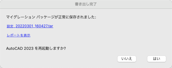注: AdMigrator ユーティリティの絶対パスを指定する必要がある場合があります。例: /Applications/Autodesk/AutoCAD¥ 2023/AutoCAD¥ 2023.app/Contents/Helpers/AdMigrator.app/Contents/MacOS/