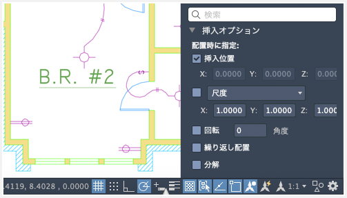 [ブロック]パレットからブロックをドラッグすると、[挿入オプション]の尺度と回転の値が使用されるようになりました。