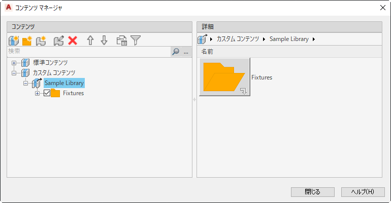 AMCONTENTMANAGER コマンドを実行すると、コンテンツ ライブラリの作成や管理を行うためのさまざまなツールを備えた[コンテンツ マネージャ]ダイアログ ボックスが表示されます。