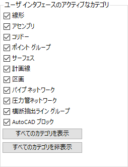 Project Explorer で特定のタスクを実行するときに、Project Explorer ウィンドウ内で使用されていない Civil 3D オブジェクト カテゴリを無効または非表示にすることが望ましい場合があります。