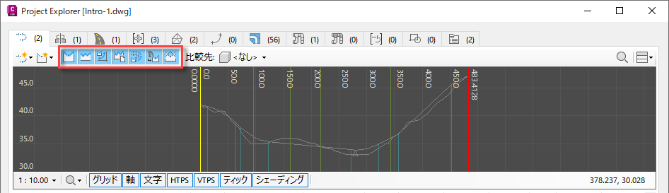 次に示すように、指定した縦断ビューまたは横断ビューの表示コンポーネントごとの鉛直異尺値と表示/非表示の設定は、メインの Project Explorer ウィンドウにある関連するビュー コントロールからもコントロールできます。