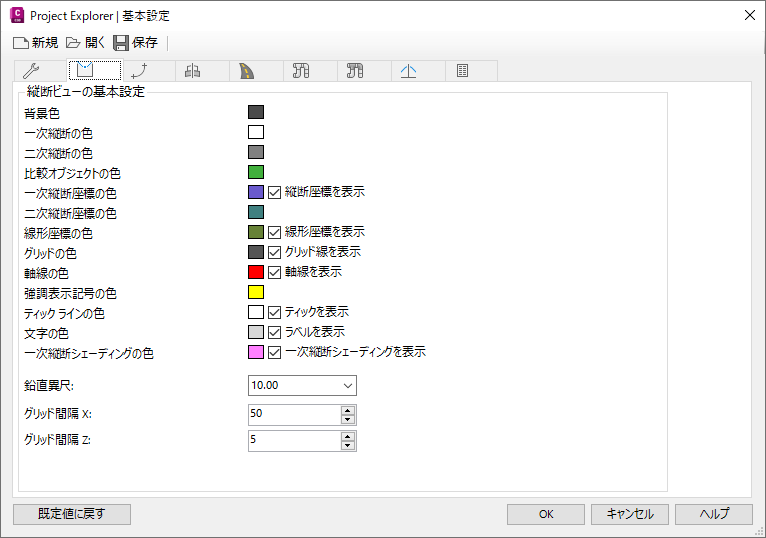 Project Explorer の[基本設定]ウィンドウの残りの 5 つのタブは、メインの Project Explorer ウィンドウにあるさまざまな縦断ビューと横断ビューの色、スタイル、グリッド、および尺度の設定をコントロールします。