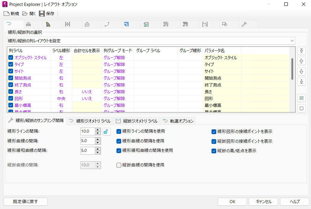 標準の列レイアウトとラベル付けオプションに加えて、[レイアウト オプション]ウィンドウの[線形]タブには、線形および縦断に関連する測点および図形データの表示と形式をコントロールするための専用のオプションが用意されています。