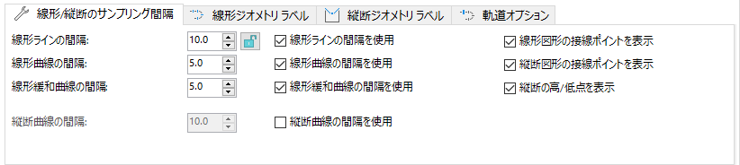 線分、緩和曲線、および曲線図形の線形の測点サンプリング間隔を設定します。必要に応じて、特定の図形タイプの間隔を無効にすることができます。これは、緩和曲線または曲線上の間隔ポイントのみが必要な場合に便利です。すべての図形タイプに共通の線形間隔を使用するには、[測点間隔をロック]チェック ボタンを使用します。