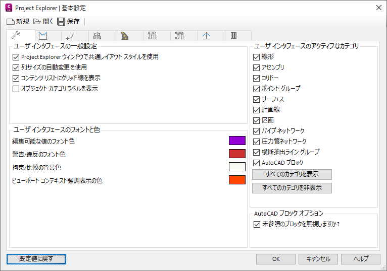 基本設定により、レポートの生成に関連しない Project Explorer ユーザ インタフェースの外観が決まります。たとえば、縦断ビューと横断ビューの色スキームと既定の尺度設定、ユーザ インタフェースのフォント設定、Project Explorer ウィンドウの個々のオブジェクト カテゴリ タブの表示/非表示とペイン レイアウトなどです。