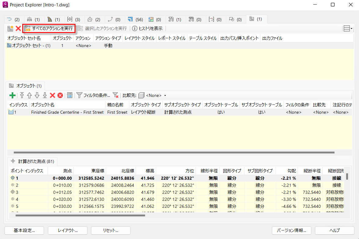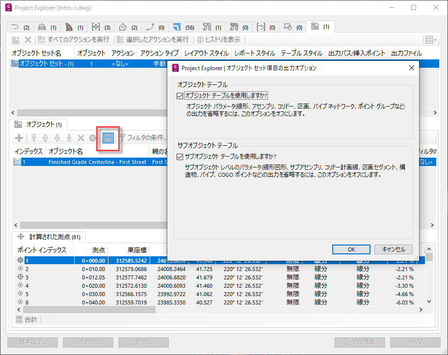 オブジェクト セットは、ユーザ定義可能な Civil 3D オブジェクトのリストで、アクションやその他の関連する詳細を割り当てることができます。アクションは、手動でトリガすることも、設計に依存するパーツが修正されたことを Project Explorer が検出したときに動的にトリガすることもできます。オブジェクト セットは通常、事前に設定されたレポート、スプレッドシート、AutoCAD 図面、または AutoCAD テーブルの作成を自動化するために使用されます。また、必要なスタイル、フィルタ、出力指示の正確な組み合わせは、割り当てられているアクションとオブジェクトのタイプによって異なります。