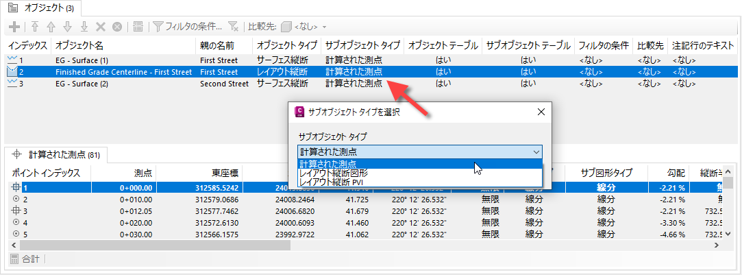 Civil 3D オブジェクト タイプによっては、リストされたオブジェクト セット項目に対して使用可能なサブオブジェクト タイプを選択できます。たとえば、線形の場合、計算された測点、線形図形、線形 PI、または横断勾配摺り付け限界測点が含まれているレポートを生成することができます。