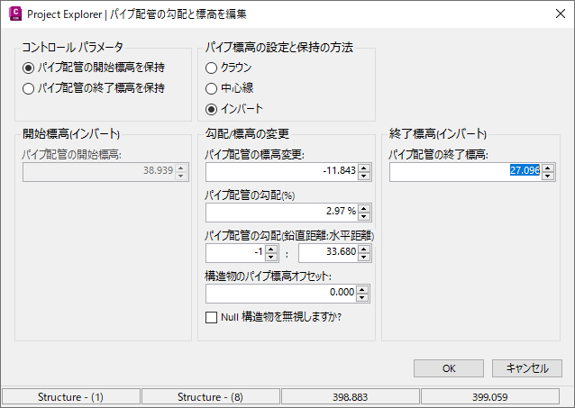 選択したパイプ配管の始点または終点の標高を保持しながら新しいパイプ勾配値を適用することができます。また、現在の配管内のパイプの直径が変更されている場合は、各構造物と交差する際にパイプのインバート、管頂、または中心線の標高を保持するよう選択できます。パイプの勾配は、パーセントまたは水平距離:鉛直距離で表すことができます。また、パイプ配管内の各構造物と交差する際の標高オフセットを適用することもできます。