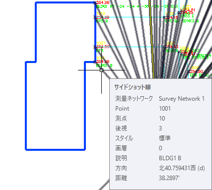 図面では、選択した測量図形がズームされます。