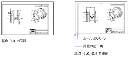 印刷オフセットでは、印刷可能領域の左下コーナー(基点)または用紙のエッジを基準にして印刷領域のオフセットを指定します。どちらを基準にするかは、[オプション]ダイアログ ボックスの[印刷とパブリッシュ]タブの[印刷オフセットの基準]オプションの設定によって決まります。[印刷]ダイアログ ボックスの[印刷オフセット]領域に、指定した印刷オフセット オプションが括弧内に表示されます。