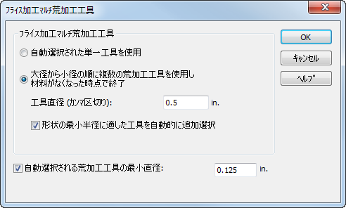 大径から小径の順に複数の荒加工工具を使用し材料がなくなった時点で終了 - 指定した複数の工具でパーツを加工します。各工具は、前の工程での削り残し領域のみを加工します。パーツが完全に加工されると、さらに小さな工具による工程が作成されることはありません。シャープ コーナーのあるパーツに適したオプションですが、より多くの工具と工具変更が必要になります。使用する工具直径を入力する必要があります。各直径はカンマで区切ります。このオプションの一部として、形状の最小半径に適した工具を自動的に追加選択 を選択することもできます。選択した場合、直径の大きい工具をいくつか指定すると、後は FeatureCAM が荒加工の最終パスの工具を自動選択します。