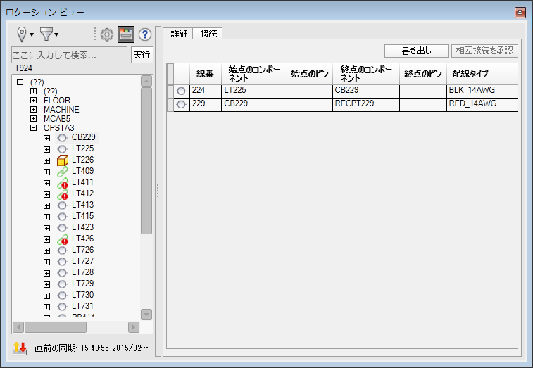 [詳細]ペインと[接続]ペインを開きます。[詳細]タブには、装置、ロケーション、カタログ値などのコンポーネントの値が表示されます。[接続]タブには、コンポーネントの配線情報が表示されます。右クリックすると、各タブに表示するフィールドを変更することができます。 |