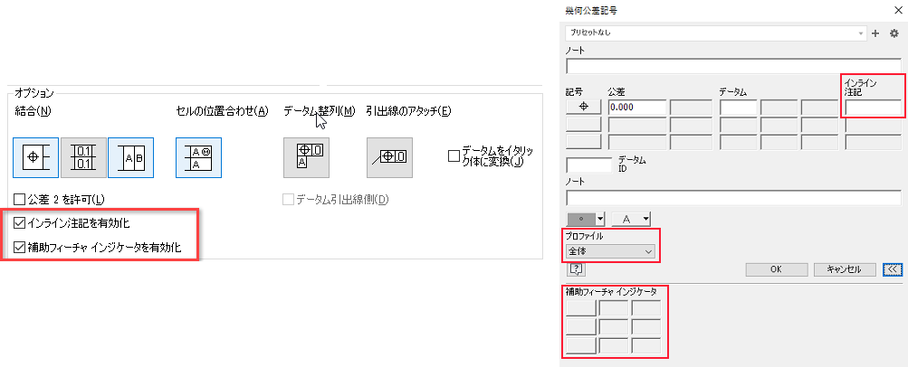 また、[幾何公差記号]ダイアログに ISO 5458 規格と ISO 5459 規格に基づいた接頭辞、接尾辞、補助フィーチャ インジケータを入力することもできます。まず、[スタイルおよび規格エディタ]ダイアログに追加された新しいチェック ボックスを使用して、オプションを有効にします。 セルに入力すると、セルが有効になることに注意してください。