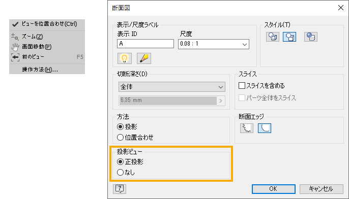断面図を作成する場合、既定では、ビューは親ビューに位置合わせされます。ベース ビューからの直交投影を無効にするには、新しい右クリック メニューの[ビューの位置合わせ]を使用します。[断面図]ダイアログ ボックスの新しい[投影ビュー]オプションを使用して、断面図の作成をコントロールすることもできます。