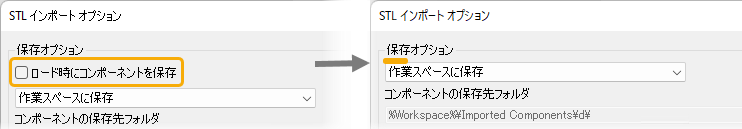 OBJ および STL のインポートについて、[ロード時にコンポーネントを保存]オプションが削除されました。