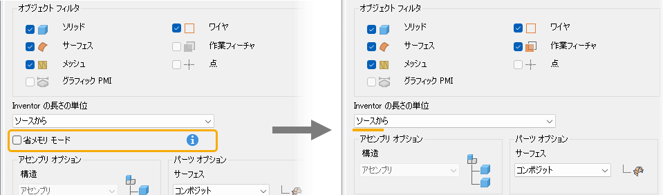 省メモリ モードが[インポート]ダイアログから削除されました。