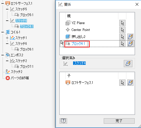 フィーチャによって使用されているスケッチ ブロックが、パーツの[関係]ダイアログ ボックスにレポートされるようになりました。