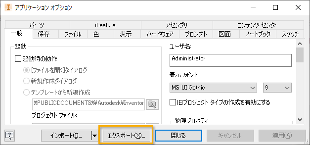| [アプリケーション オプション]ダイアログ ボックスで、[エクスポート]をクリックします。[エクスポート]では、現在のアプリケーション オプションおよび[iLogic 環境設定]ダイアログ ボックスの設定が .xml ファイルに保存されます