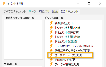 [イベント トリガ]ダイアログ ボックスに、「ユーザ パラメータの変更」という新しいイベントが追加されました。このイベントは、ユーザ パラメータの値を変更したときにトリガされます。